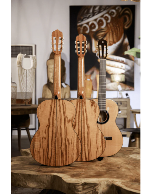 Idéale pour mettre en valeur des accompagnements ou des mélodies, cette guitare devient votre alliée musicale en toute situation. La table en cèdre, associée aux éclisses et au fond en olivier, crée un équilibre parfait entre définition et clarté.