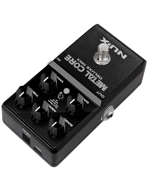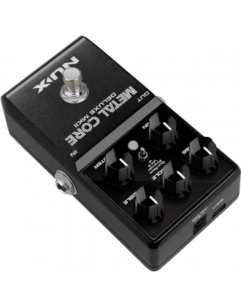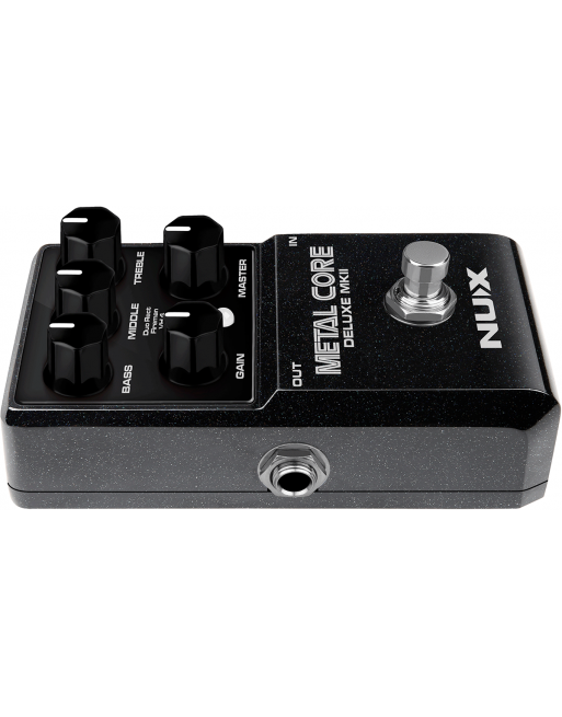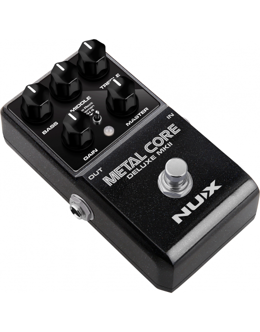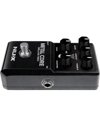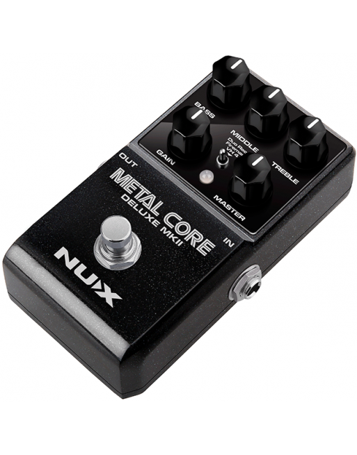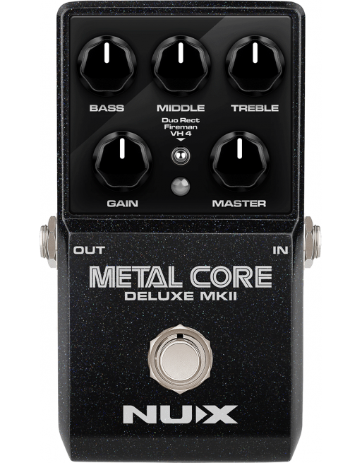 La Métal Core Deluxe MKII de NUX est une pédale de préampli intégrant 3 modélisations d'ampli à gain élevé : Duo Rect, Fireman et VH4.