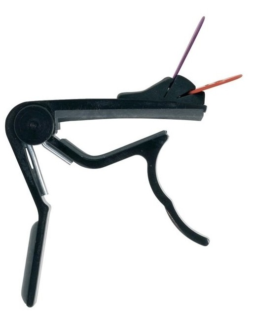 Avec support médiator (vendu sans mediators) Utilisable d'une seule main Aluminium, extra léger, 50g Caoutchouc bombé, largeur 56mm Mécanisme à ressort robuste Aluminium noir brillant