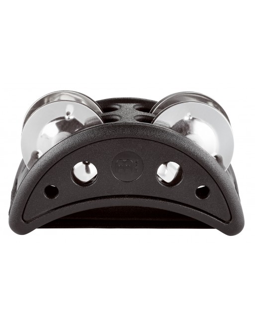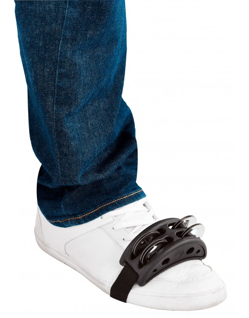 Tambourin pour pied compact, corps synthétique, cymbalettes en acier inox, lanière élastique, mise en place facile, ergonomique