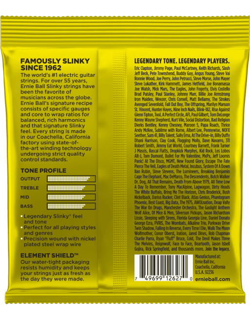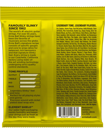 LE jeu de cordes incontournable. Adopté par Eric Clapton, Jimmy Page, Slash, Angus Young et une légion de légendes ! Ces cordes sont fabriquées en respectant un cahier des charges très strict propre à Ernie Ball qui garantit une performance optimale. L'âme hexagonale accueille un fil de nickel pour une durée de vie accrue.