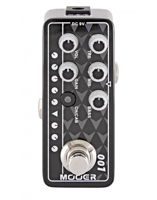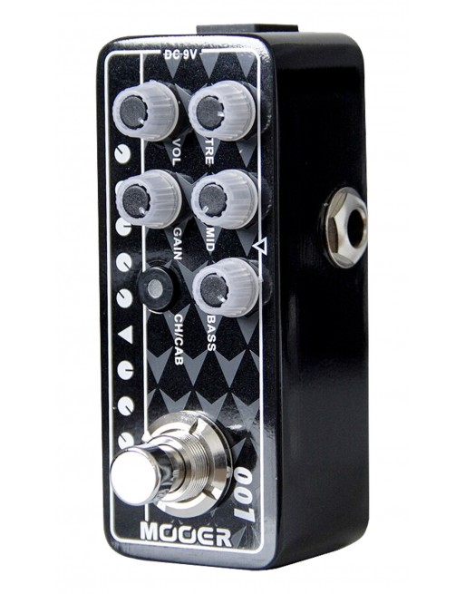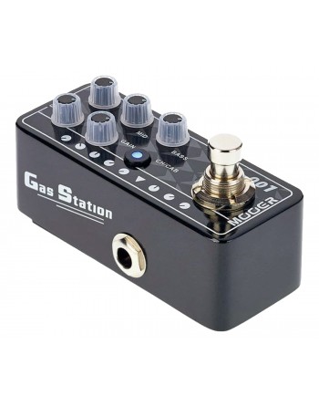 Pédale GAS STATION, préampli numérique type Hi-Gain moderne, deux canaux, EQ 3 bandes par canal, simulation HP, boîtier métal, alimentation par adaptateur 9V (non fourni), consommation: 300mA, dimensions: 93.5 x 42 x 52mm, poids: 160g.