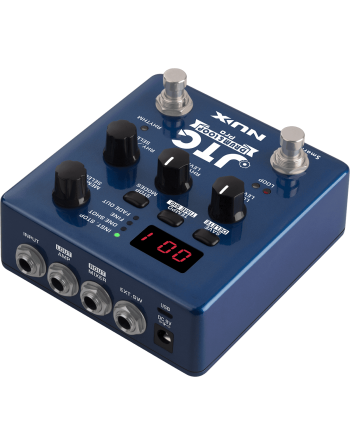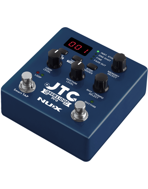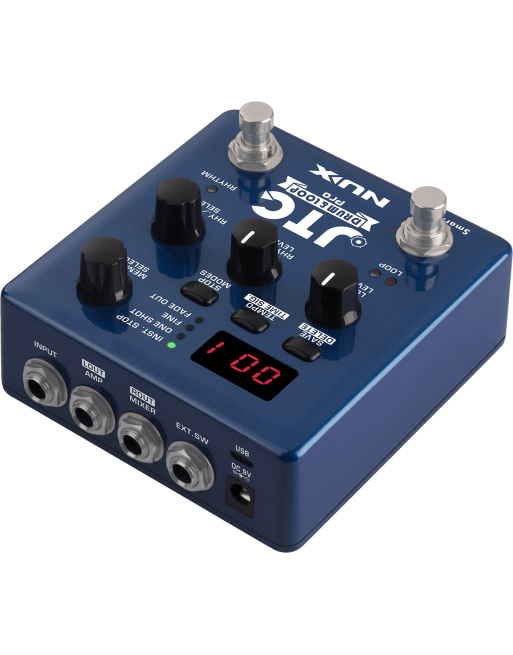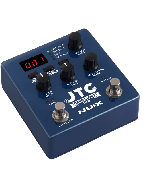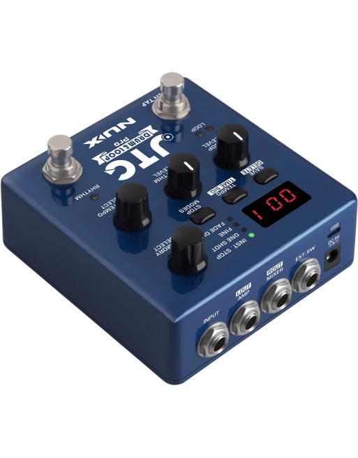La JTCDrum & Loop est une pédale deux-en-un, intégrant à la fois un looper et une boîte à rythmes des plus complètes. Le looper met à votre disposition jusqu'à 6 heures de capacité d'enregistrement sur 256 emplacements utilisateur, de sorte à ce que vous ne soyez jamais à court d'espace. Le pilotage au pied du looper est assuré par le commutateur multifonction de gauche, selon un schéma de fonctionnement bien éprouvé : un appui pour démarrer l'enregistrement, un nouvel appui pour le couper et démarrer la lecture, et un troisième pour enregistrer des overdubs. Un appui long permet également de couper et réactiver la lecture de l'overdub. Un second schéma de fonctionnement, activant l'overdub dès le second appui, est également disponible !