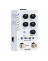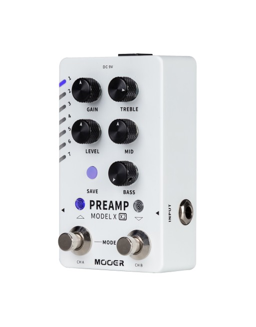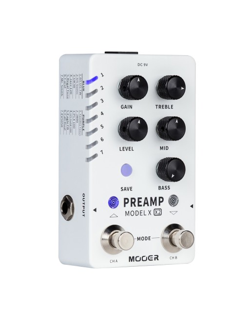 Pédale PREAMP MODEL X X2, préamplificateur numérique deux canaux, 14 presets, technologie déchantillonnage MNRS, 3 simulations d'enceinte préinstallées, 14 modèles d'amplificateurs préinstallés avec deux canaux chacun (Clean/Drive), prise en charge des fichiers IR tiers, édition par logiciel gratuit, double footswitch, boîtier métal, true bypass, alimentation par adaptateur 9V (non fourni), consommation: 300mA, dimensions: 115 x 75 x 33mm, poids: 334g.