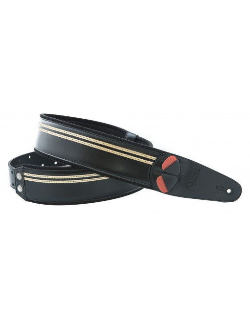 Courroie modèle RACE, extérieur synthétique, doublure microfibres, extrémités 100% synthétique, rembourrage haute densité, largeur 6 cm, longueur 95 à 150 cm, porte-médiators intégré. NOIR ET OR