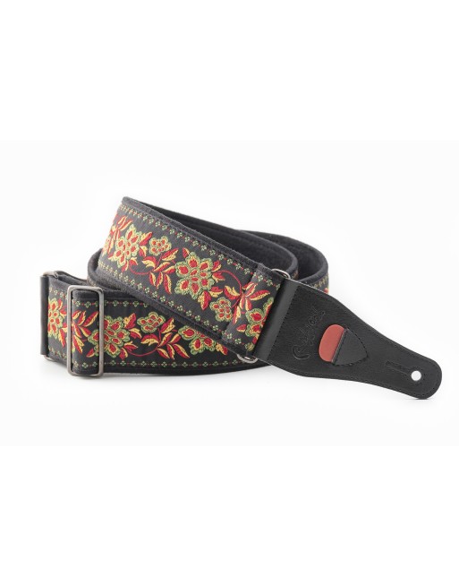 Courroie modèle ROSES II, tissu Jacquard, doublure microfibres, extrémités 100% synthétique, rembourrage haute densité, largeur 6 cm, longueur 90 à 150 cm, porte-médiators intégré.