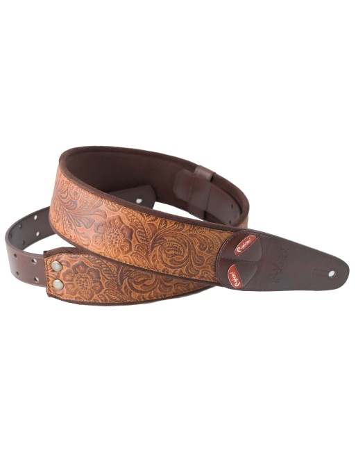 Courroie modèle SANDOKAN, extérieur tissu, doublure microfibres, extrémités 100% synthétique, rembourrage haute densité, largeur 6 cm, longueur 95 à 150 cm, porte-médiators intégré.
