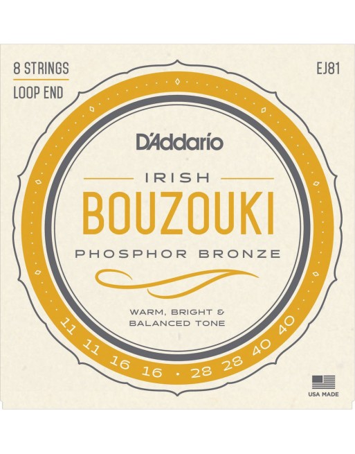 Les cordes D'Addario EJ81 sont conçues pour les bouzoukis irlandais de différentes tailles. Les cordes sans filet sont fabriquées en acier, et les cordes filées sont en bronze phosphoreux, apprécié dans le monde entier pour sa durabilité remarquable et ses excellentes qualités sonores.