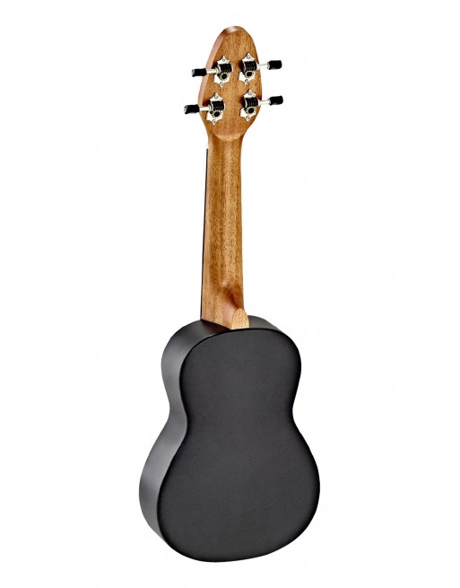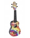 Pack Ukulélé Soprano, table agathis design"Peace 68", corps ABS légèrement galbé, manche okoume, 12 frettes, diapason 364 mm, touche & chevalet ABS, mécaniques ouvertes avec boutons noirs, cordes Ortega, avec accessoires (accordeur clip, courroies, médiators, housse à cordon).